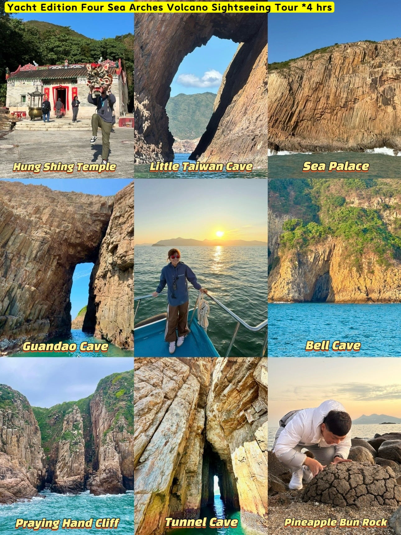快適なヨットでジオパーク四つの海食アーチ火山観光ツアーを体験しましょう! 香港のユネスコ世界ジオパークで行われるこのゆったりとした4時間のボートツアーでは、世界最大の六角形火山岩柱群を鑑賞し、10の素晴らしい地質名所を探検できます。全ての年齢層に適しており、ハイキングや水に入る必要なく、自然の驚異を快適に楽しめるツアーです。