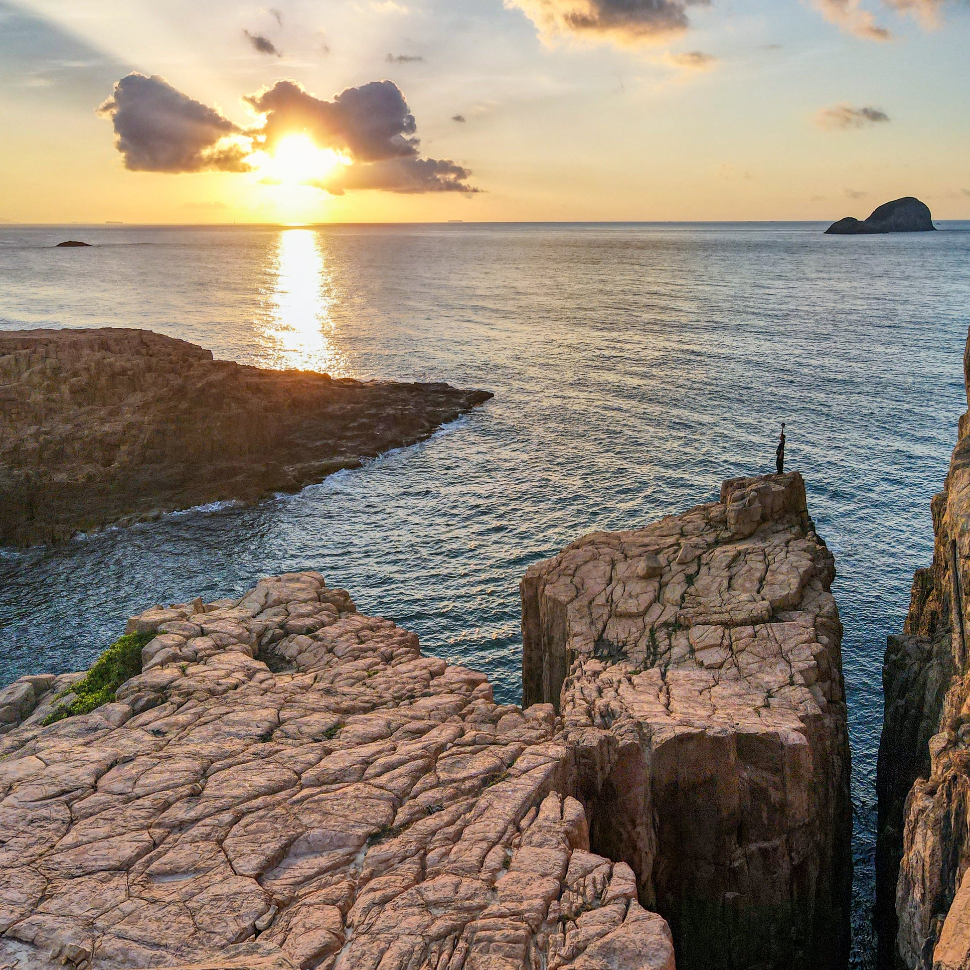 North Ninepin Island features the striking Moon Cliff and Big Cannon Rock, both formed by volcanic activity around 140 million years ago. Moon Cliff showcases broad slopes with unique hexagonal rock patterns, while Big Cannon Rock is a massive, horizontally extending hexagonal column resembling a giant cannon. Both are key highlights of Hong Kong’s UNESCO Global Geopark.