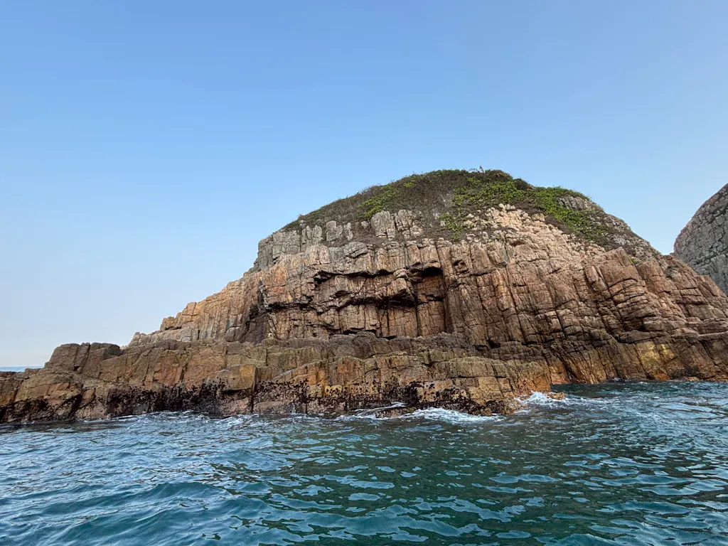홍콩 지질공원 보트 투어의 세 번째 기착지는 포핀차우에 있는 **갓 컷 해협**입니다. 이 아름다운 해협은 1억 4천만 년 전 화산 폭발로 형성된 육각형의 화산암 기둥이 특징입니다. 약 300미터에 달하는 이 해협은 물 위로 솟아오른 이 웅장한 암석들이 푸른 바다와 극명한 대조를 이루는 숨 막힐 듯 아름다운 경관을 선사합니다.