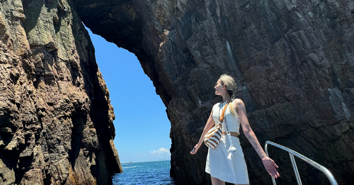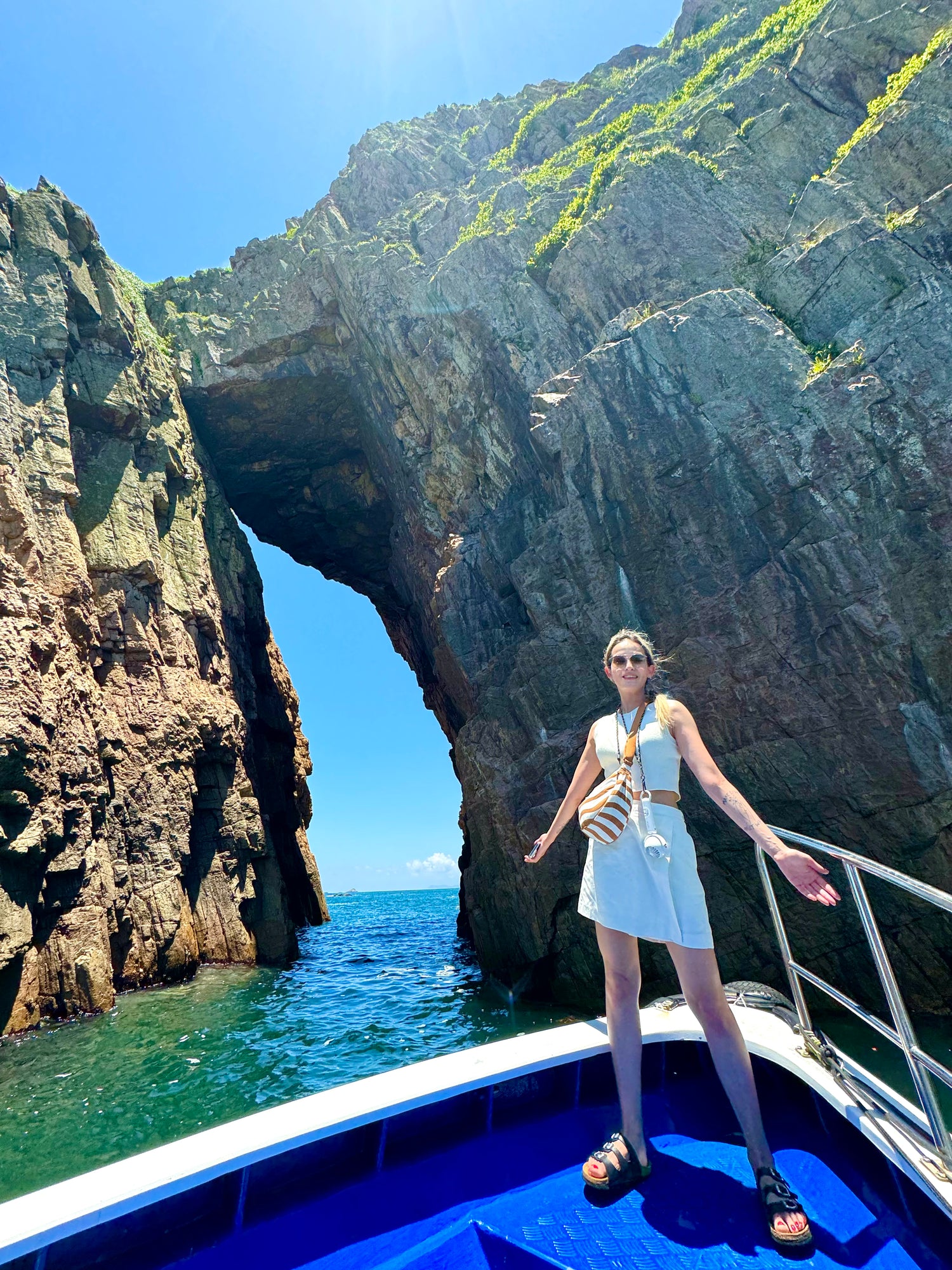 홍콩 지질공원 보트 투어의 네 번째 목적지는 왕차우에 있는 **리틀 타이완 동굴**입니다. 이 아름다운 바다 아치는 약 1억 4천만 년 전 고대 화산 활동으로 형성된 육각형 화산암 기둥으로 유명합니다. 대만의 모습을 닮은 이 독특한 동굴은 숨 막힐 듯 아름다운 기둥들이 방문객을 사로잡는 매혹적인 분위기를 자아냅니다.