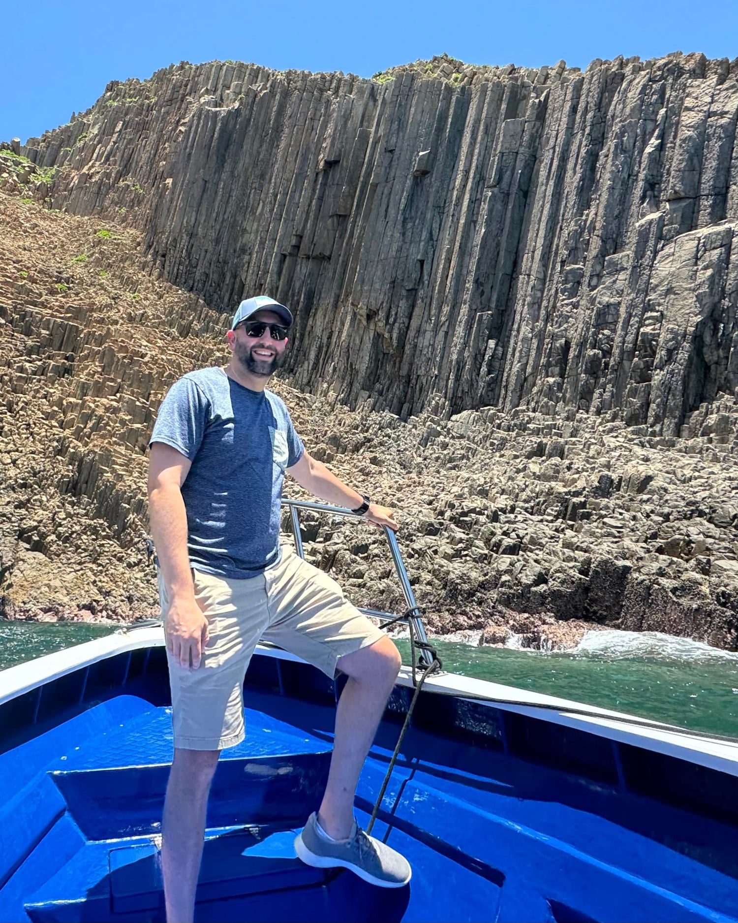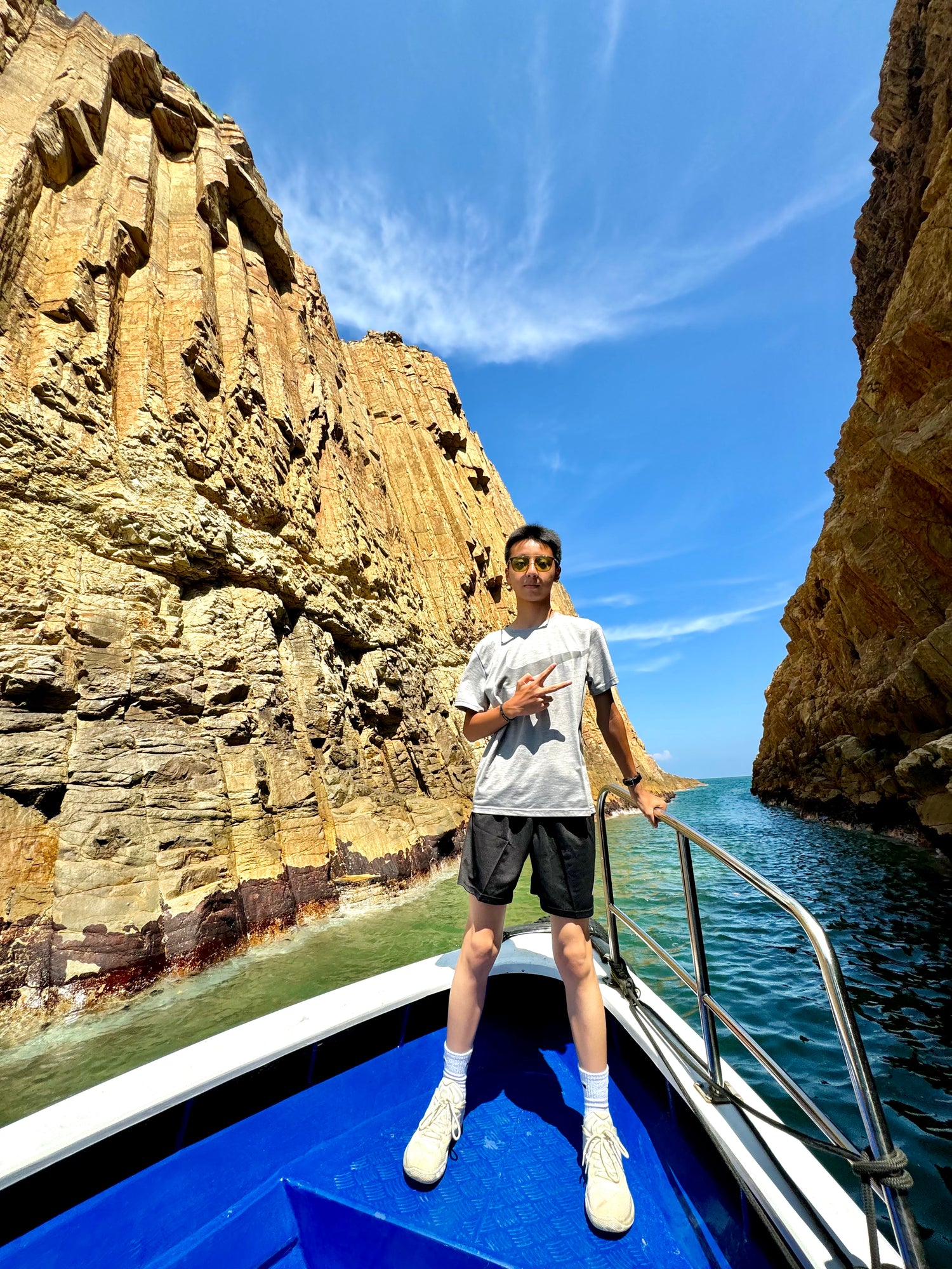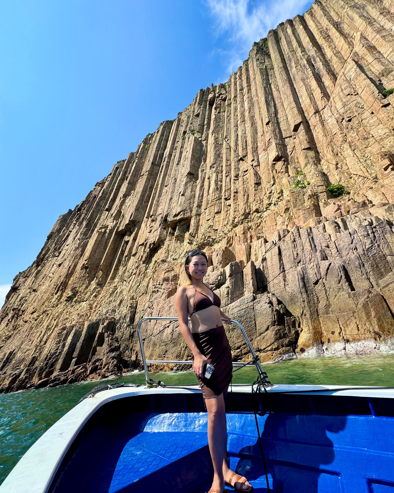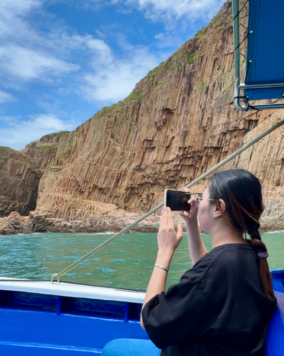 홍콩 지질공원 보트 투어의 세 번째 기착지는 포핀차우에 있는 **갓 컷 해협**입니다. 이 아름다운 해협은 1억 4천만 년 전 화산 폭발로 형성된 육각형의 화산암 기둥이 특징입니다. 약 300미터에 달하는 이 해협은 물 위로 솟아오른 이 웅장한 암석들이 푸른 바다와 극명한 대조를 이루는 숨 막힐 듯 아름다운 경관을 선사합니다.