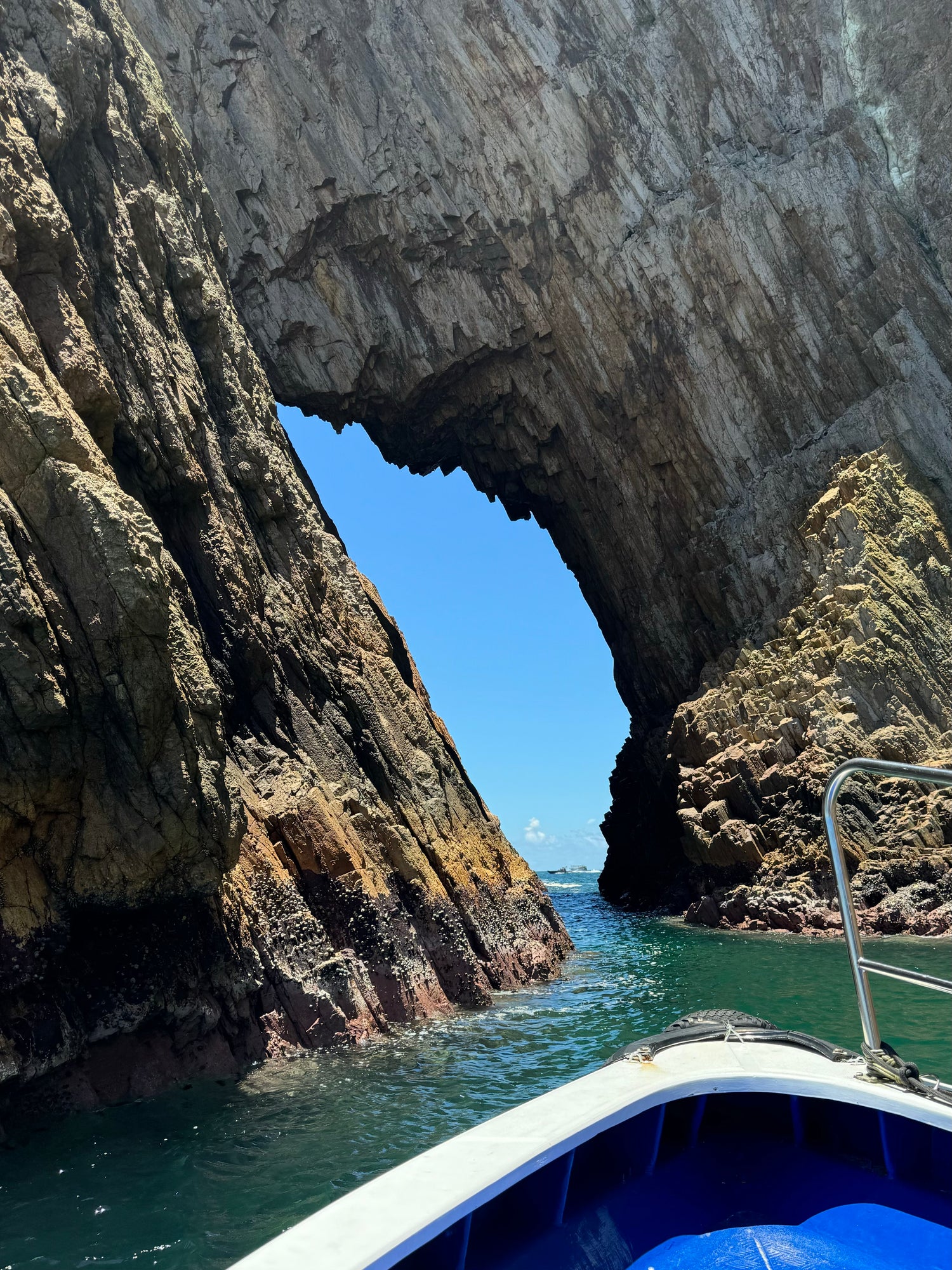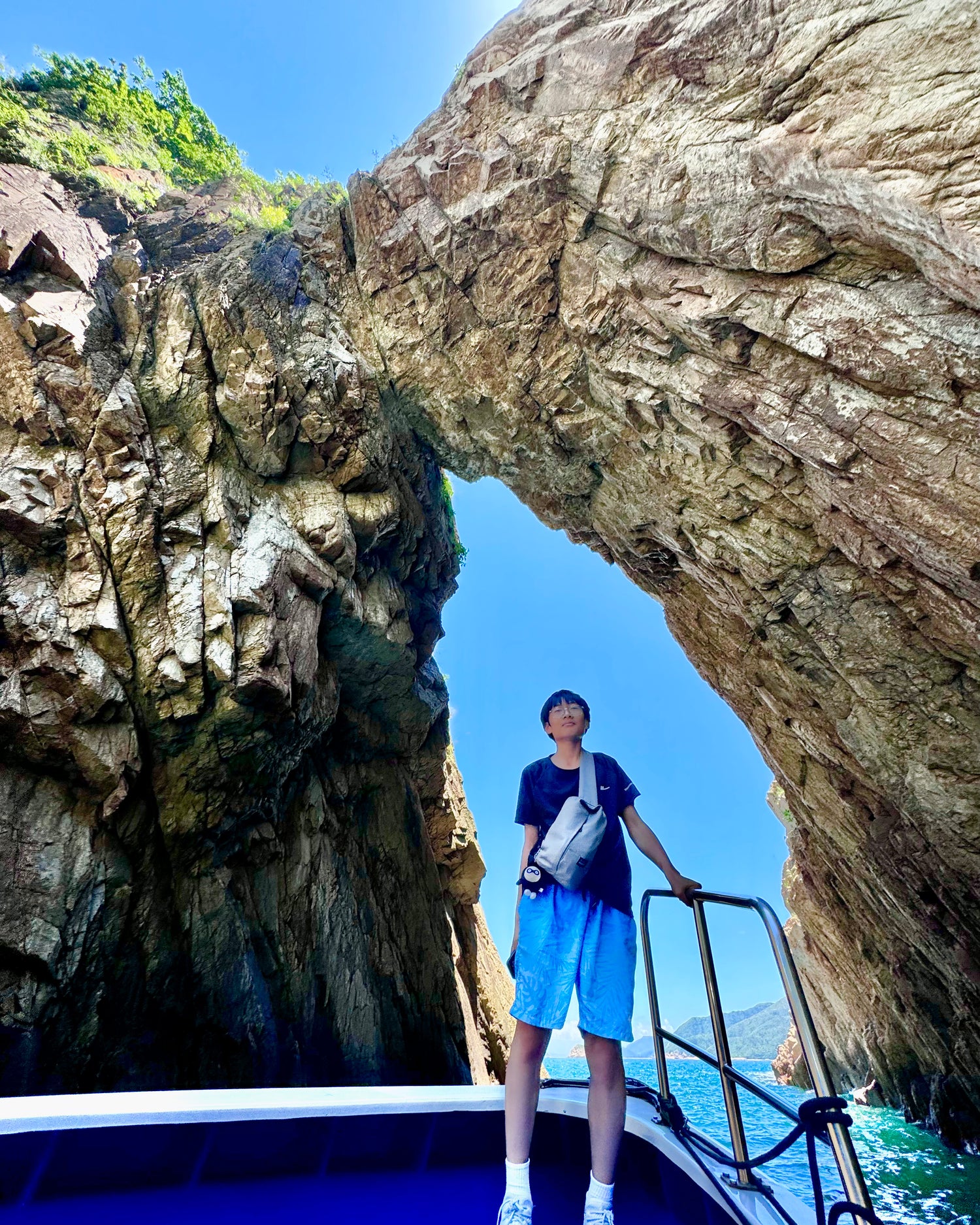 스플리디보트 홍콩 지질공원 보트 투어의 여덟 번째 기착지는 진섬에 있는 **벨 케이브**입니다. 이곳은 동해의 4대 해식 아치 중 가장 넓은 해식 아치로 유명합니다. 높이가 30미터에 달하는 이 웅장한 지질학적 지형은 사원의 종을 닮았으며, 수 세기에 걸친 해식 침식으로 형성되었습니다. 파도 조건이 허락한다면, 스피드보트는 이 놀라운 해식 아치를 통과하며 방문객들에게 웅장한 암석 지형을 가까이서 감상할 수 있는 특별한 기회를 제공합니다.