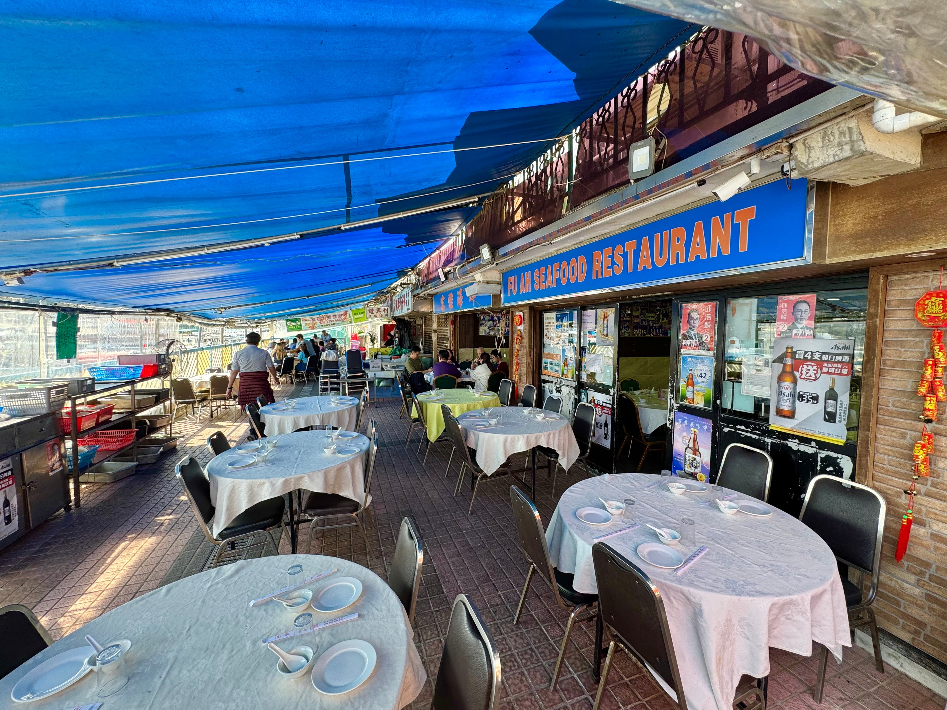Fu Ah Seafood Restaurant features a lively harborside atmosphere typical of Sai Kung's famous Seafood Street, with open-air terrace seating overlooking the bustling waterfront promenade and fishing boats. Indoor areas offer air-conditioned comfort. Live seafood tanks of other restaurant line the entrance, creating an authentic, casual fishing village vibe perfect for groups enjoying fresh catches in a relaxed, scenic setting.