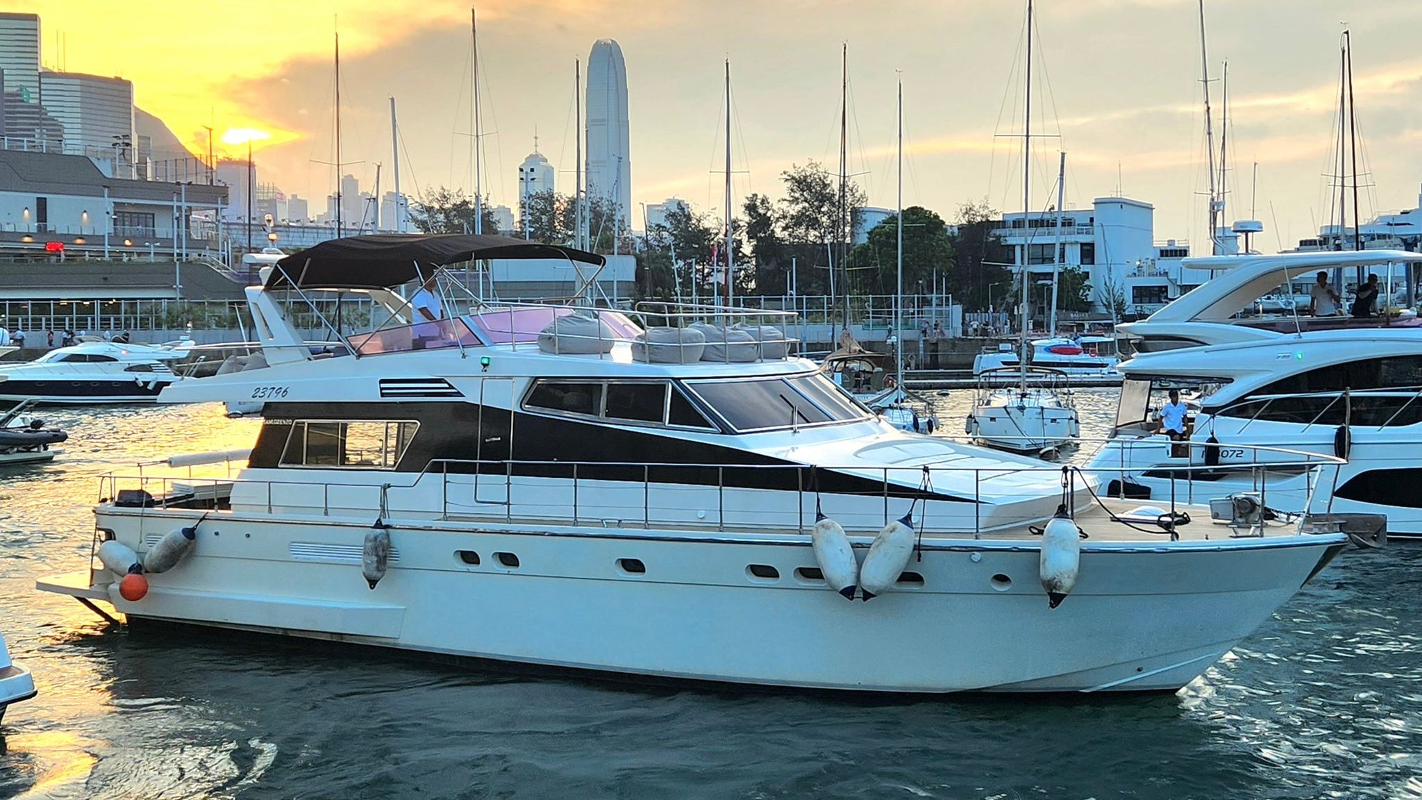 Yacht's prime sunset stop—Casting a golden glow over Tsim Sha Tsui waterfront as you sightseeing for uninterrupted viewing before fireworks ignite.