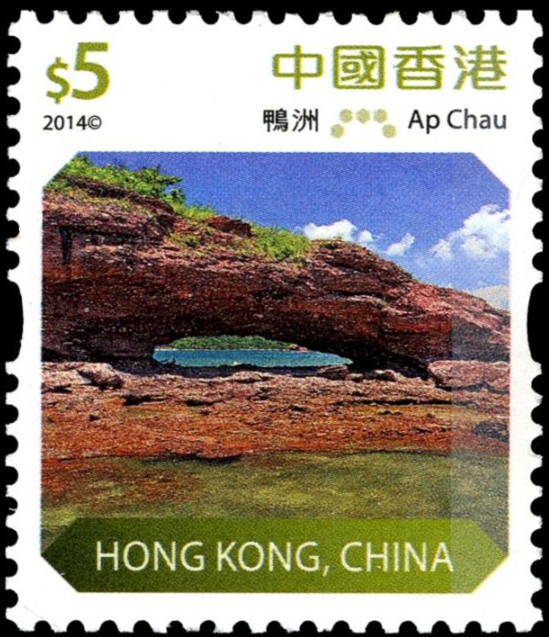 The $5 Hong Kong definitive stamp features Ap Chau, showcasing the Duck Eye Cave as its theme. Issued in 2014, it highlights the island's unique geological formations and natural beauty, representing a significant aspect of Hong Kong's coastal landscape.