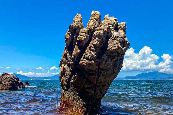 The Devil's Fist is a striking rock formation located at the end of Wong Chuk Kok Tsui (formerly known as Bluff Head) in Plover Cove Country Park, characterized by its unique shape resembling a fist, formed through 400 million years of geological processes including weathering and coastal erosion.