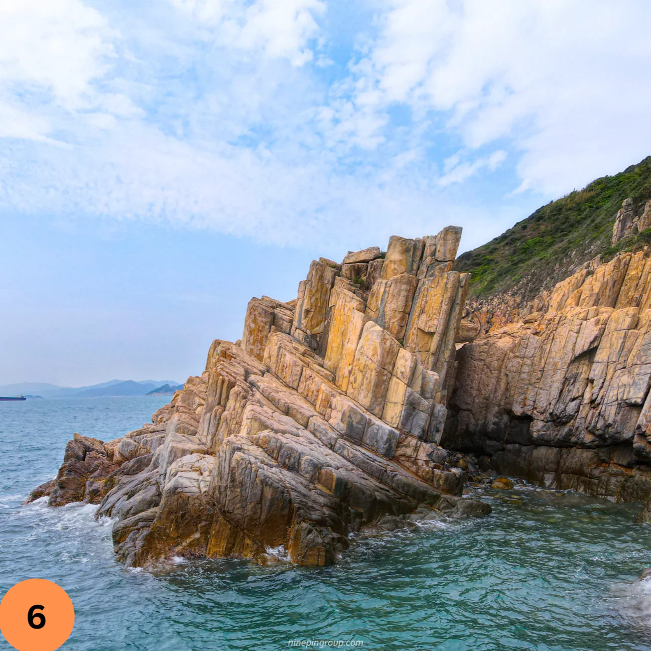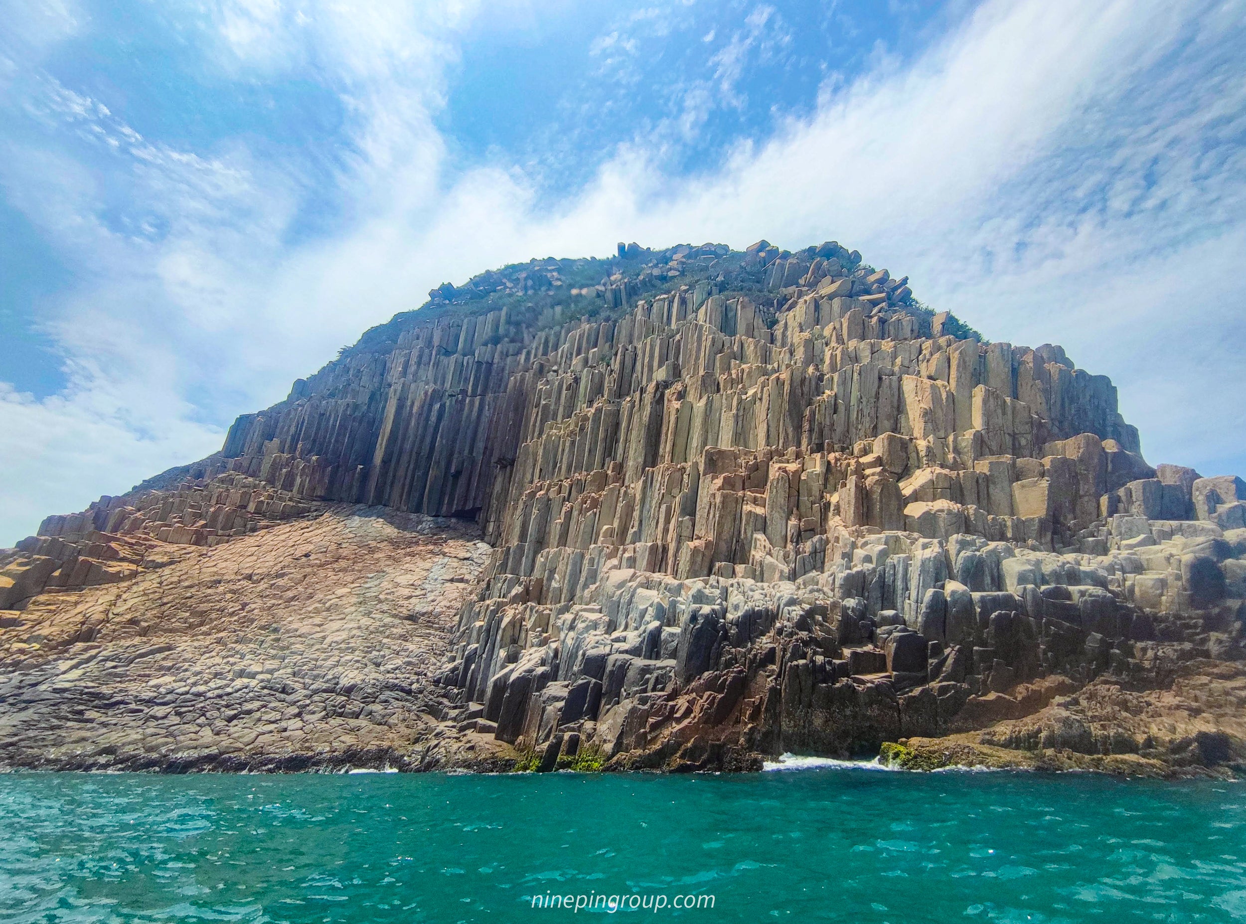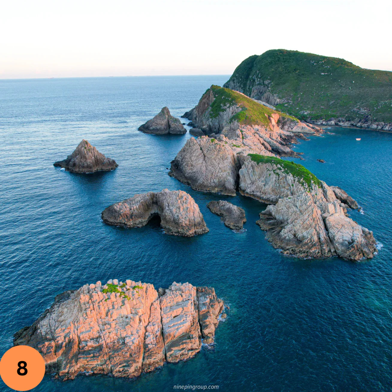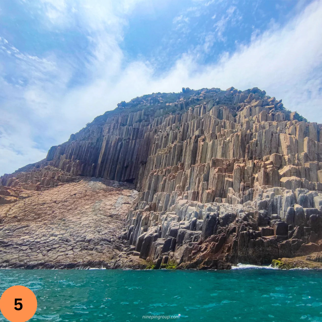 North Ninepin Island features the striking Moon Cliff and Big Cannon Rock, both formed by volcanic activity around 140 million years ago. Moon Cliff showcases broad slopes with unique hexagonal rock patterns, while Big Cannon Rock is a massive, horizontally extending hexagonal column resembling a giant cannon. Both are key highlights of Hong Kong’s UNESCO Global Geopark.