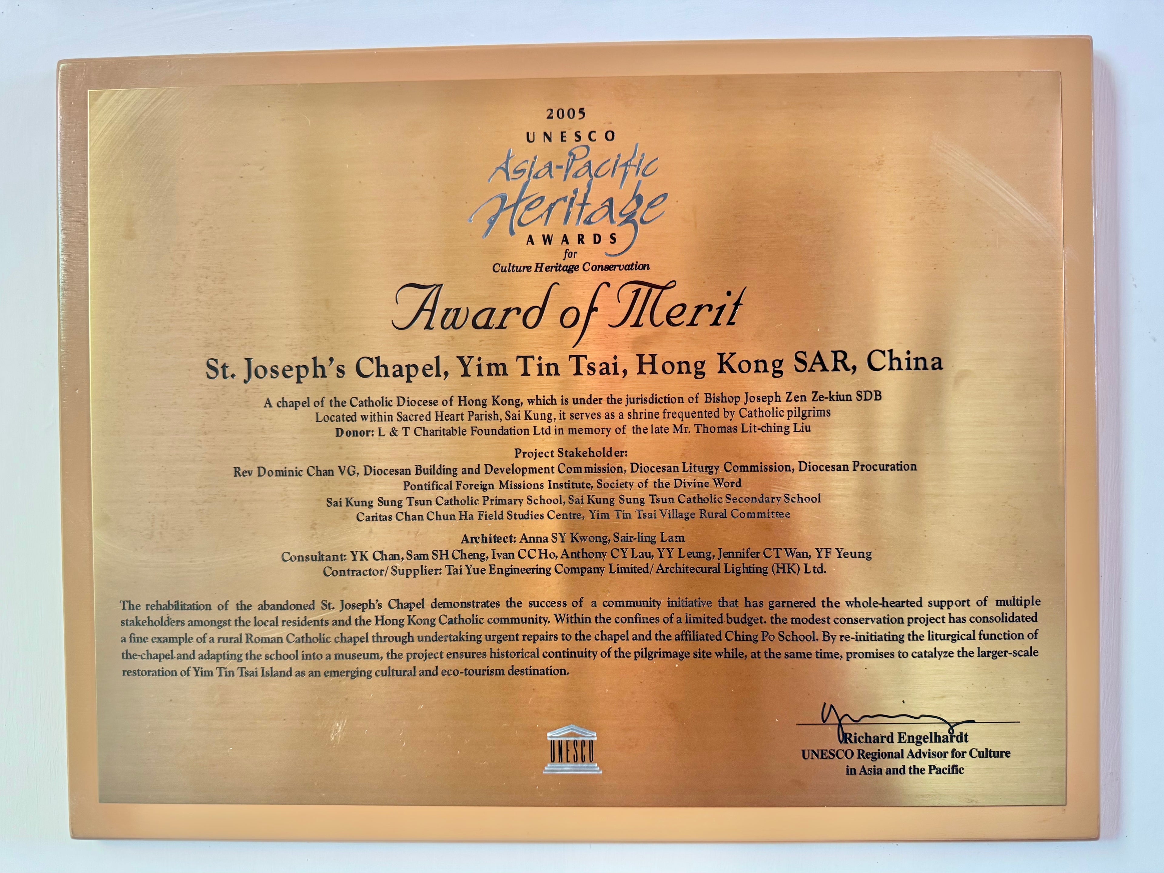 Recognizes outstanding conservation efforts in Sai Kung, including the historic Tin Hau Temple complex, St. Joseph's Chapel, and Hung Shing Temple at Kau Sai Chau, highlighting community-driven preservation of cultural and religious landmarks. This not only underscores the importance of preserving heritage sites but also reflects Hong Kong's rich multicultural tapestry, where diverse religious and cultural traditions coexist harmoniously, contributing to the city's vibrant cultural landscape.