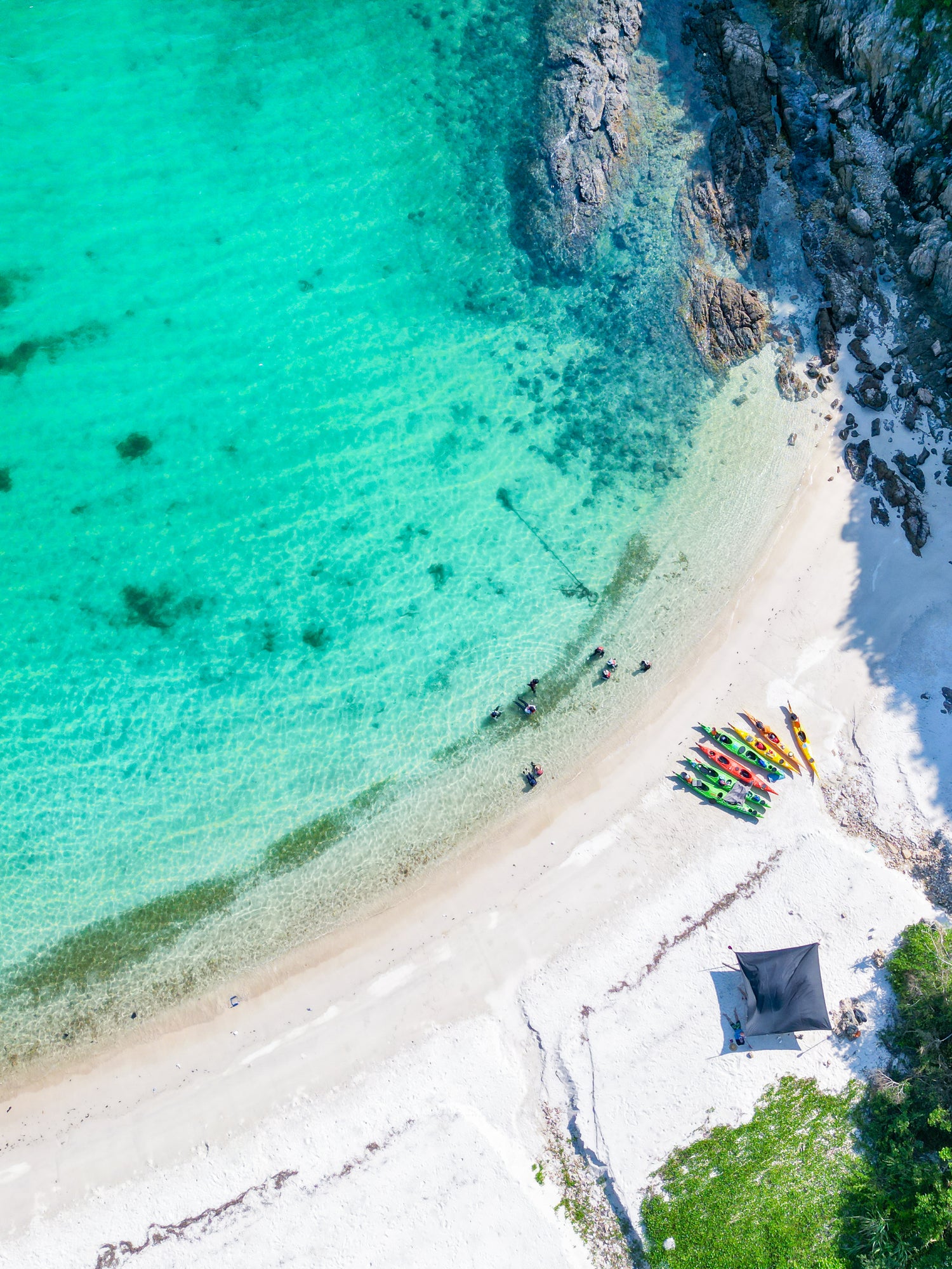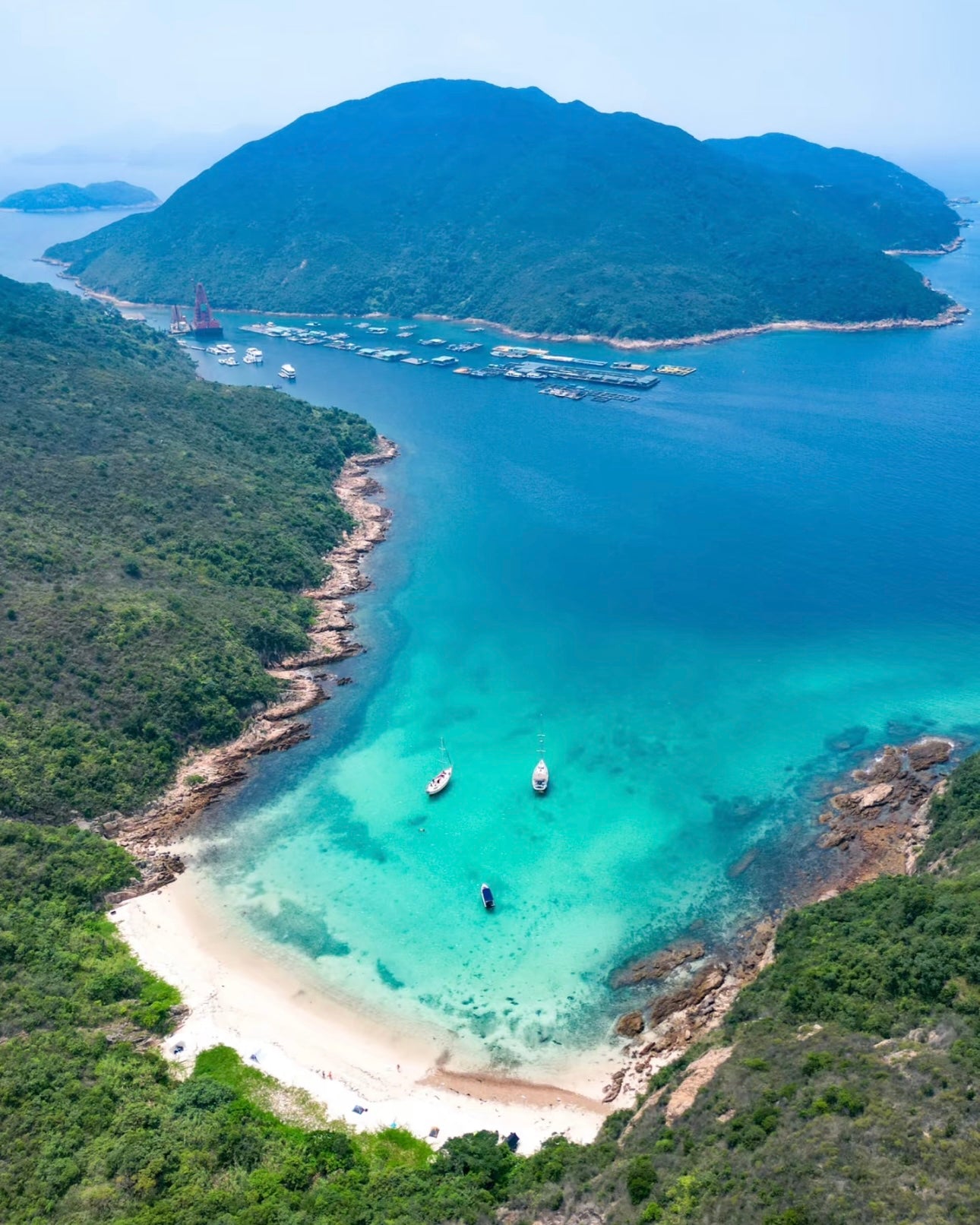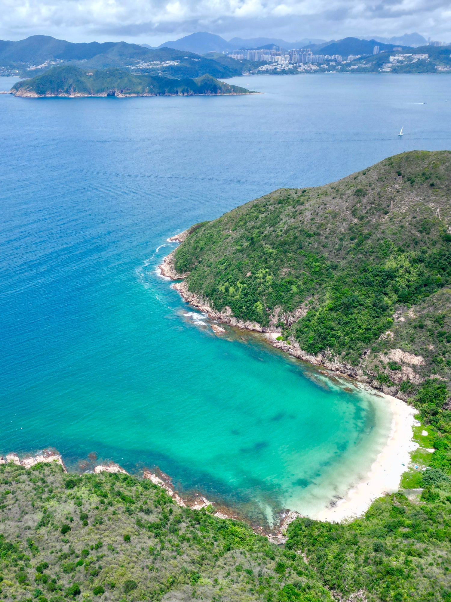 The bird's eye view of Kau Sai Wan reveals a stunning U-shaped inner bay, framed by lush greenery. This picturesque setting features calm, clear waters ideal for swimming and snorkeling, creating a serene escape. The beach's gentle curves invite visitors to explore its sandy shores, while the surrounding landscape showcases Hong Kong's natural beauty, making it a perfect destination for relaxation and outdoor activities.