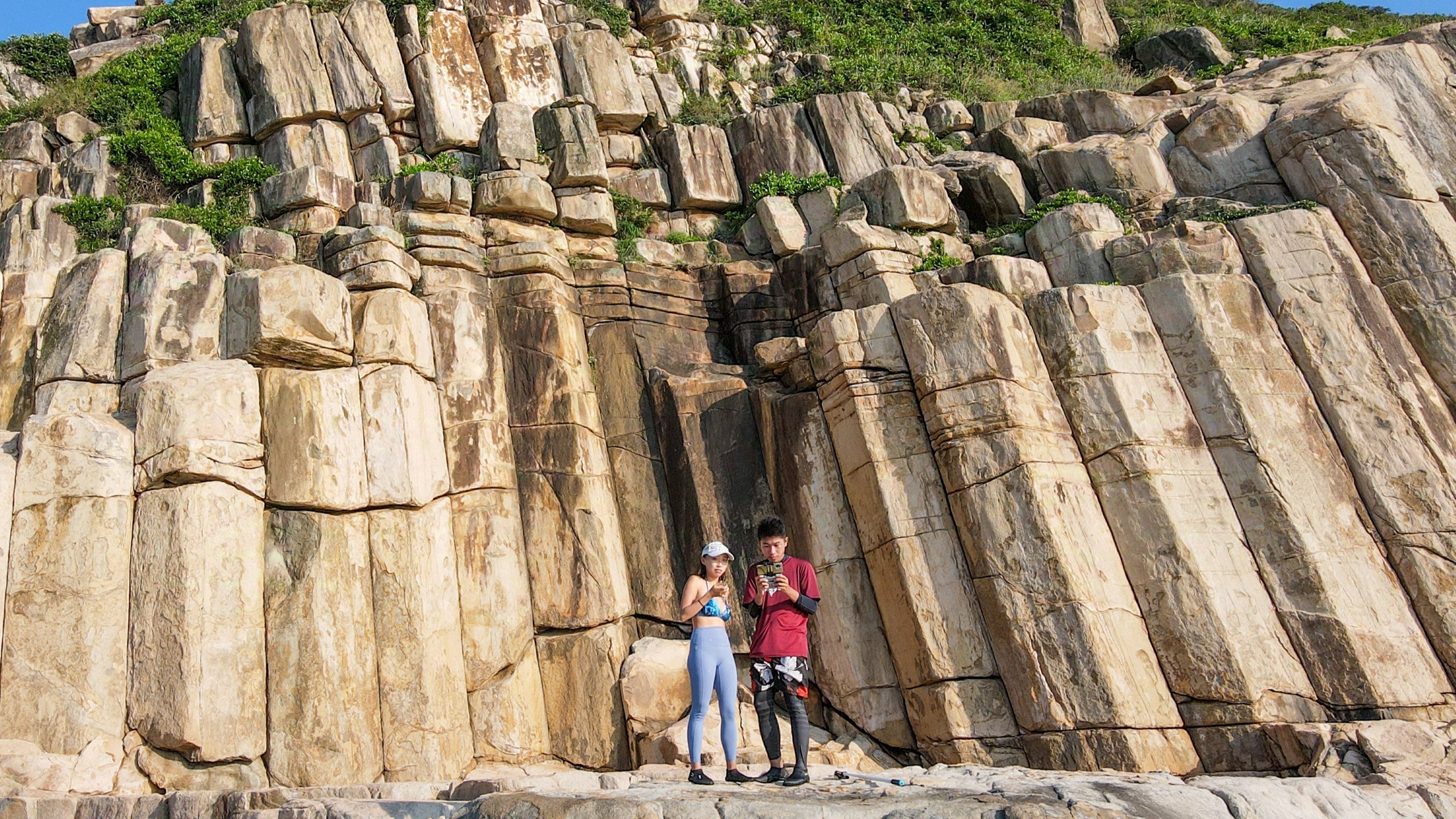 "Outdoor Temple"—a natural enclosure formed by towering hexagonal volcanic rock columns. Sunlight filters through the column gaps, creating a cathedral-like atmosphere. This sanctuary showcases nature's architecture and geological wonders, reminiscent of ancient sacred spaces. These features are also a part of the Hong Kong UNESCO Global Geopark.