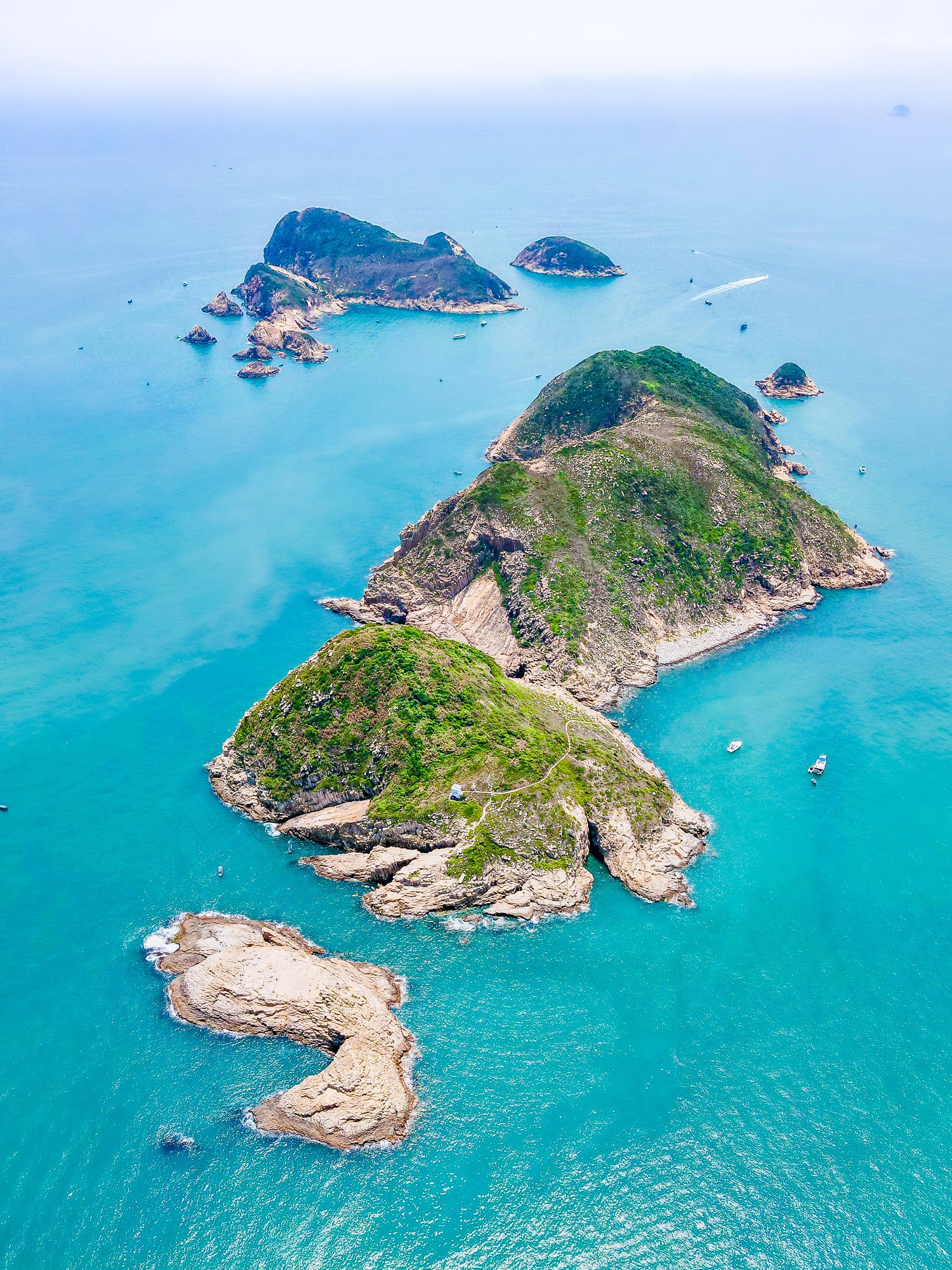 The Ninepin Group, also known as Kwo Chau Islands, consists of 29 islands in Hong Kong's easternmost waters. The most notable islands are North Ninepin Island and South Ninepin Island. North Ninepin Island features hexagonal rock columns. South Ninepin Island is known for sea caves, including the Tiger Mouth cave, rock arches, and coastlines eroded by the sea and wind. The Ninepin Group showcases Hong Kong's geological wonders.