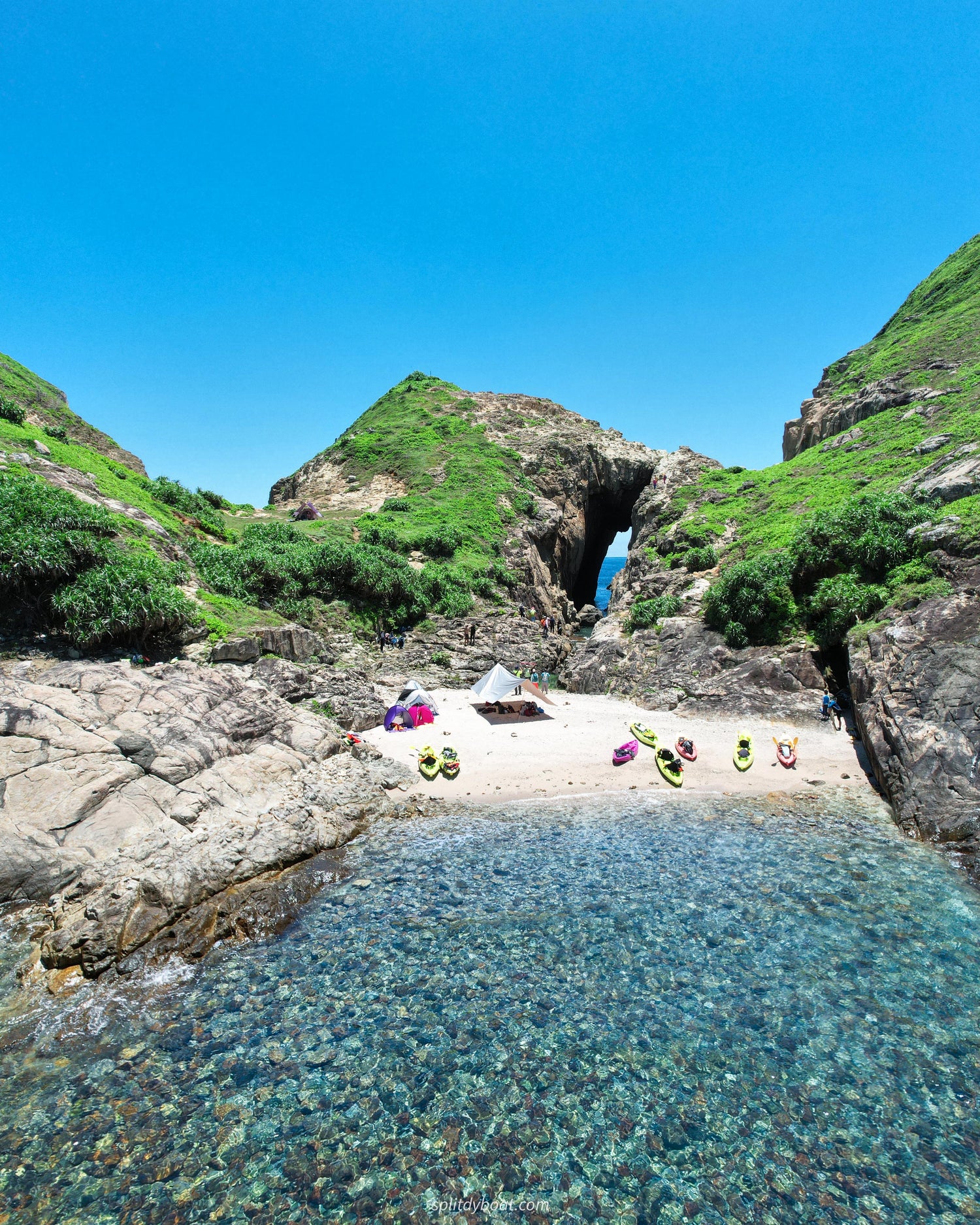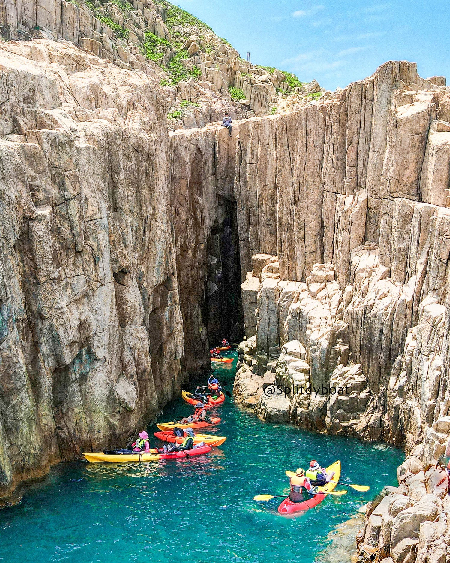 Experience Splitdyboat's 2-hour Geopark North Ninepin Island Kayaking Tour. Explore sea caves, arches, and hexagonal columns. If wave permits, paddle through the 'Big Stove Arch'. The tour departs from Clear Water Bay Second Beach after a speedboat transfer.