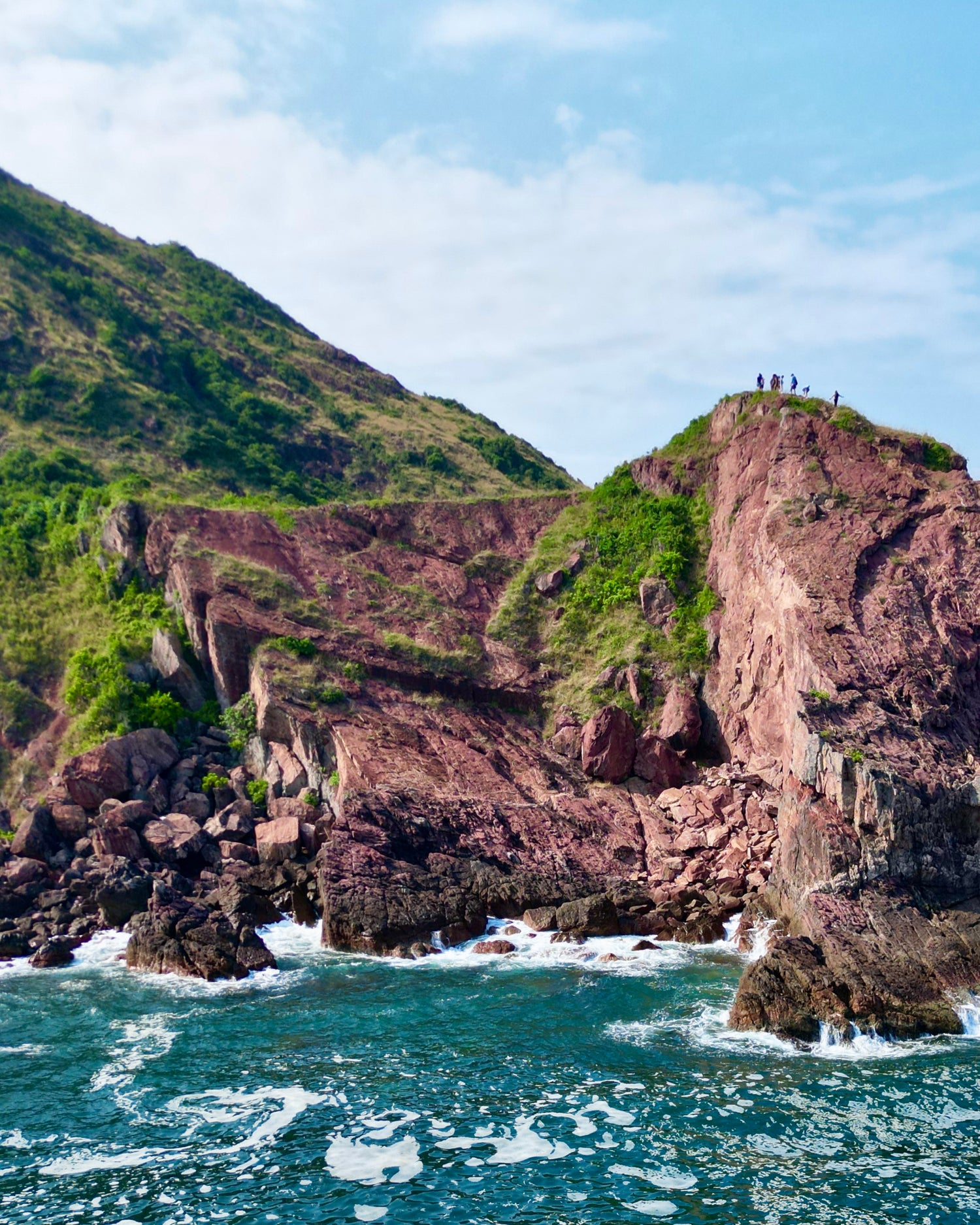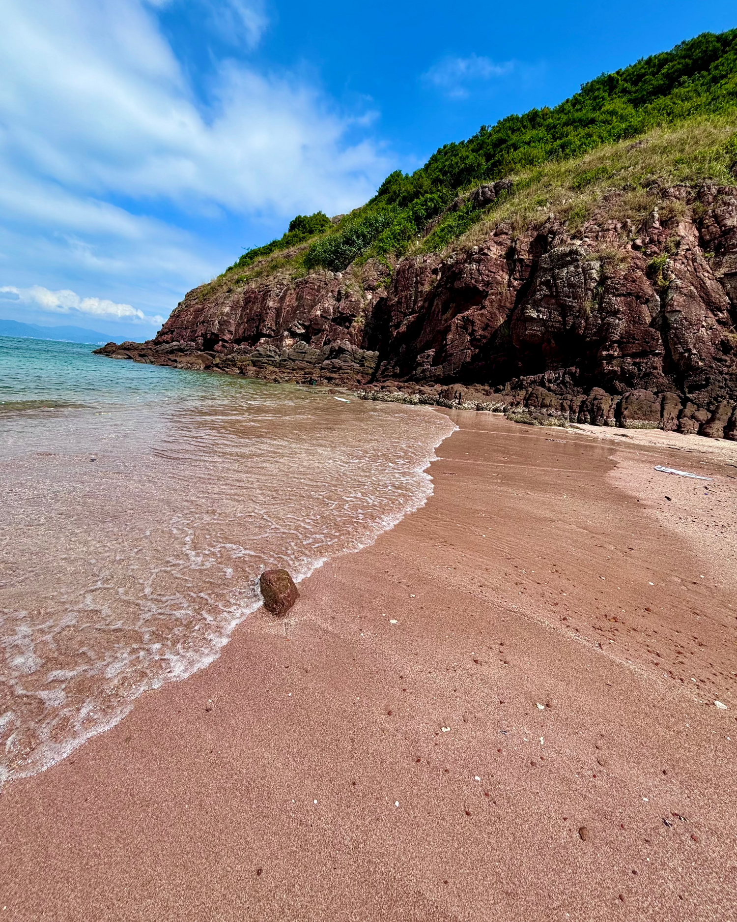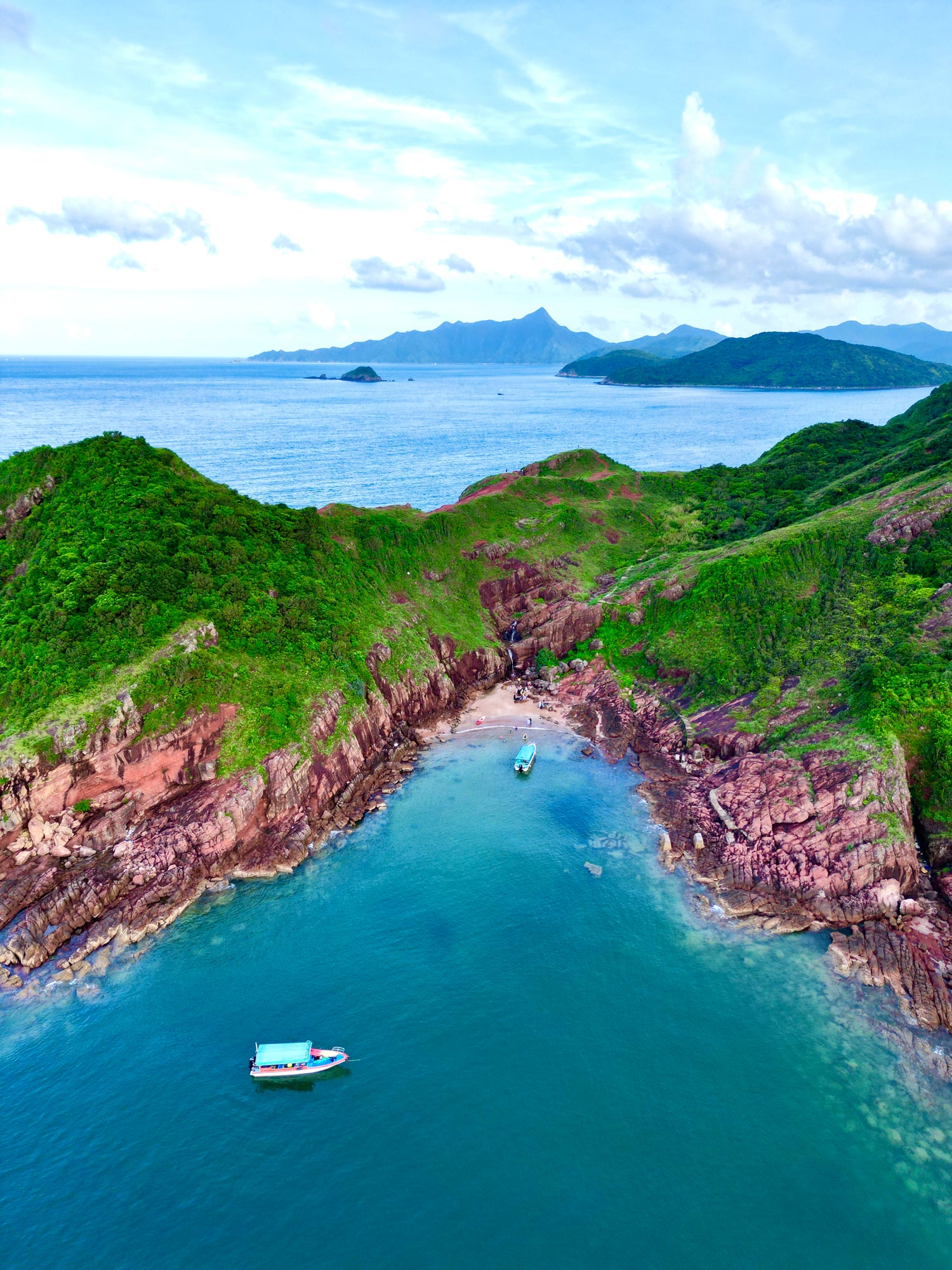 Tai Wan Bay on Port Island is a picturesque coastal area known for its vibrant reddish rock formations that contrast beautifully with the clear blue waters, creating a stunning natural landscape that attracts visitors seeking tranquility and scenic views.