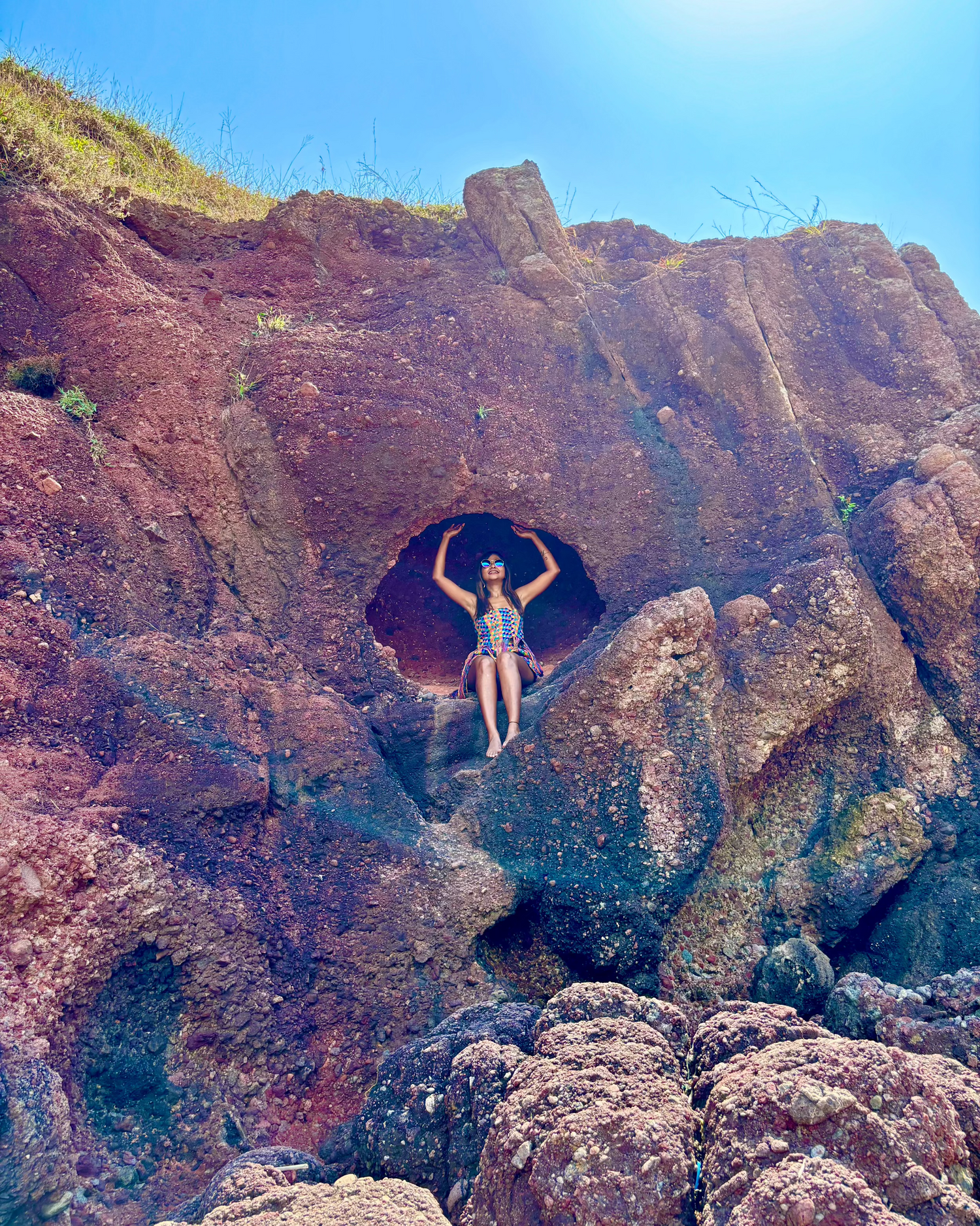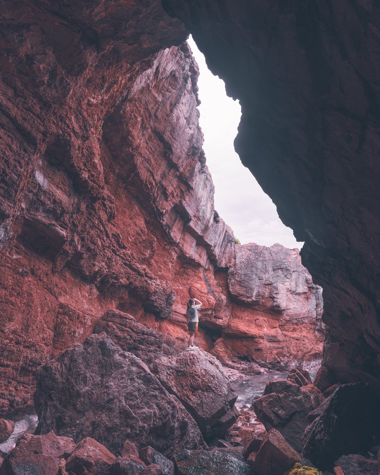The Port Island Cave is an intriguing geological feature that showcases the island's distinctive reddish sedimentary rocks, primarily composed of iron-rich conglomerates and sandstones, which have been shaped by erosion and weathering processes; this vibrant red coloration, resulting from oxidation in an arid climate, beautifully complements the cave's rugged entrance and enhances the overall allure of this unique coastal landscape.
