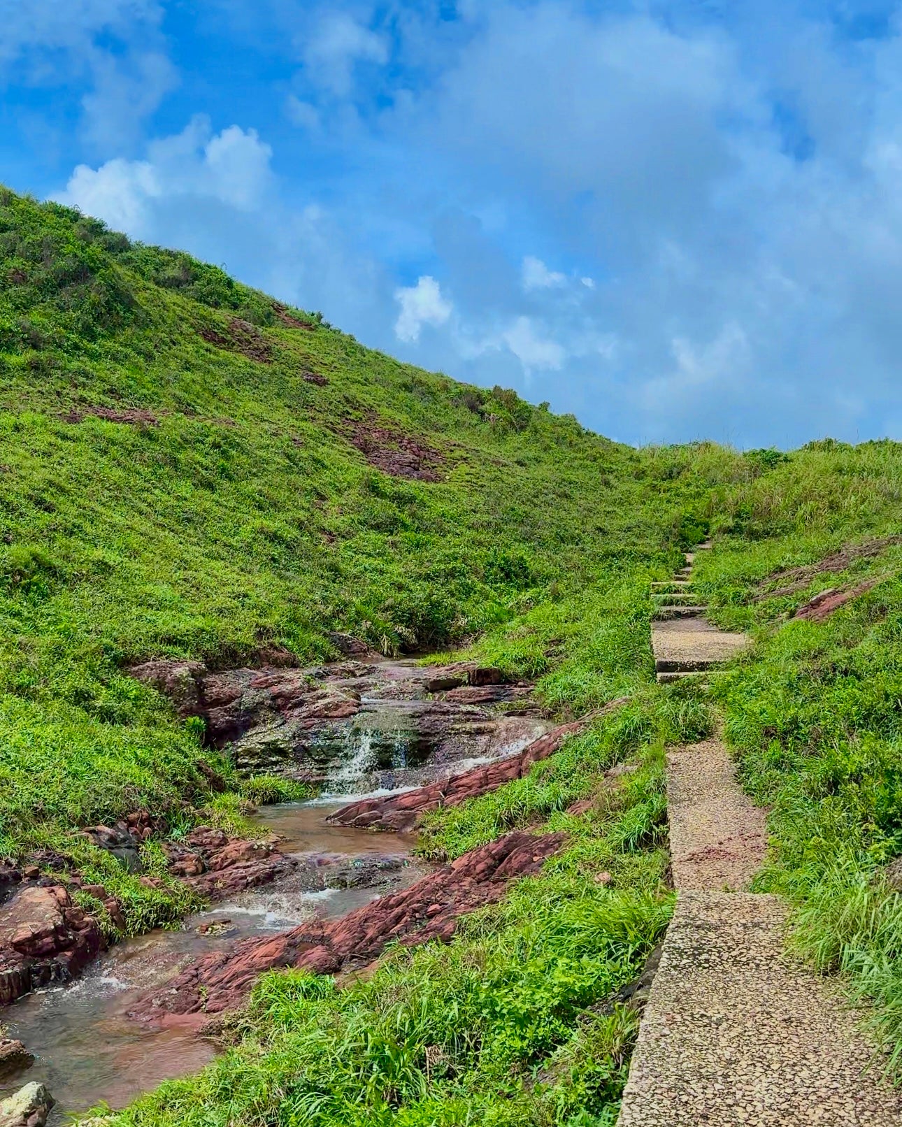The seasonal streams on Port Island come alive after rain, creating enchanting waterways that evoke the whimsical landscapes of Hayao Miyazaki's world, with lush greenery and vibrant red rock formations framing the crystal-clear water as it flows gently through the island.
