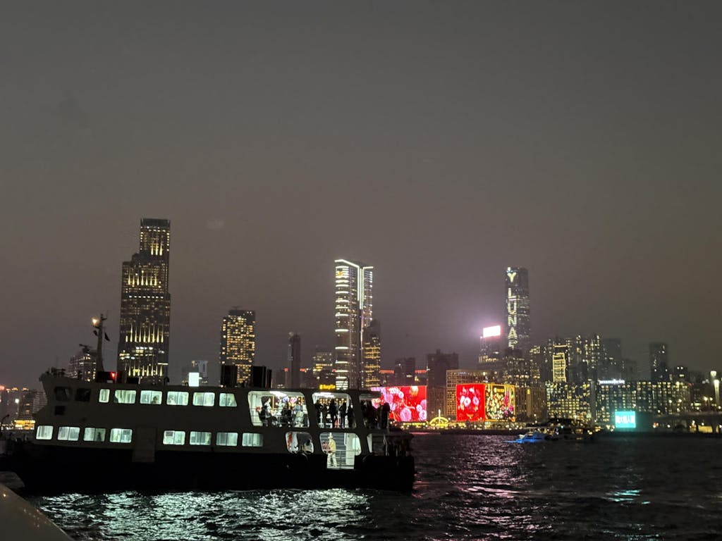 As night falls, Victoria Harbour transforms with dazzling city lights. The iconic spectacle illuminates skyscrapers in rhythmic color, creating a mesmerizing symphony of light against the dark sky.