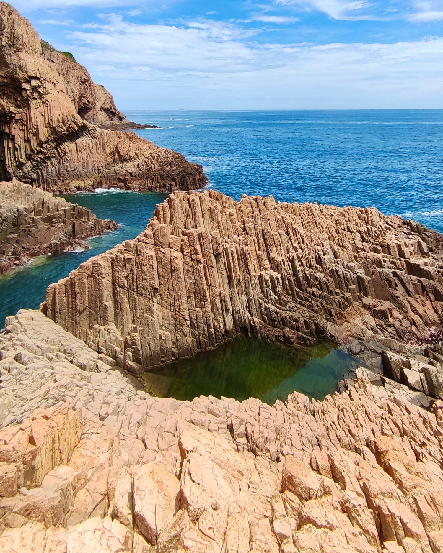 The Imperial Consort's Pool in Wang Chau is a stunning tide pool surrounded by impressive hexagonal volcanic rock columns. This unique geological feature showcases vibrant marine life and offers a serene spot for relaxation, reflecting the area's rich volcanic history and natural beauty, making it a captivating destination for visitors.