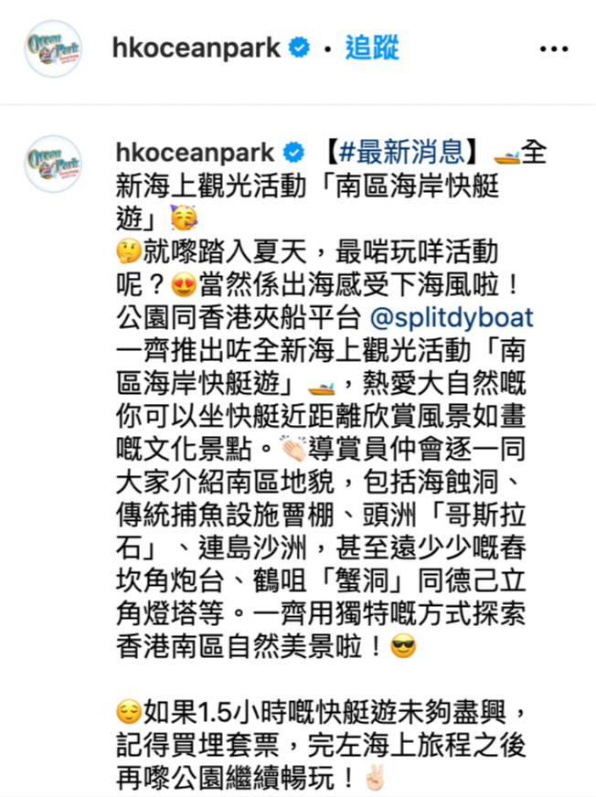 在2024年,香港海洋公園與Splitdyboat合作,創作引人入勝的Instagram Reels,推廣全新設計的南區海岸快艇遊(這是Splitdyboat為此次活動專門設計的快艇遊),展示一個激動人心的教育冒險,專為對南區有興趣或熱愛大自然的人士而設。
