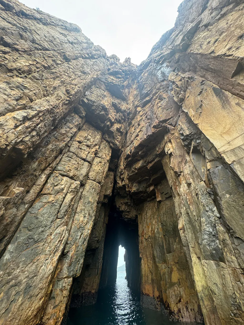 香港地質公園觀光遊船的第七站是**沙塘口洞**,這是一個引人注目的海蝕洞,長達45米,形狀類似隧道。這個獨特的海蝕洞內佈滿著壯觀的六角形火山岩柱,展示了約1億4千萬年前古老火山活動所形成的迷人地質特徵。當遊客靠近這個令人印象深刻的海蝕拱門時,將被岩柱的精緻紋理和質感所吸引!