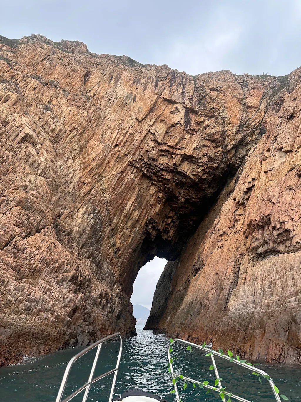 香港地質公園船遊的第四站是位於橫洲的**小台灣洞**。這個壯觀的海蝕拱門以其令人印象深刻的六角形火山岩柱而聞名,這些岩柱是在約1億4千萬年前的古老火山活動中形成的。小台灣洞的形狀類似台灣,展示了一系列壯麗的岩柱,創造出迷人的氛圍,讓遊客陶醉於其震撼的形成中。