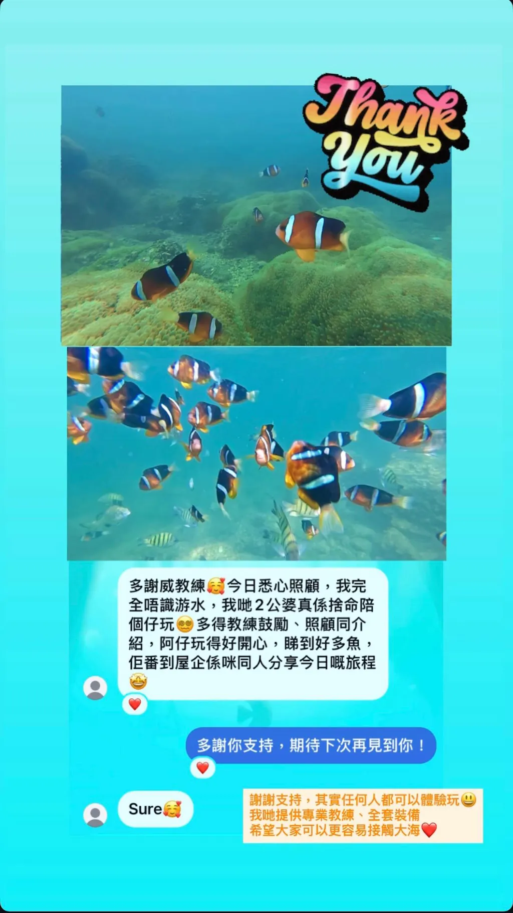 對於第一次浮潛嘅我泥講,無論係環境上睇海洋生物嘅安排,定係教練嘅帶領同指導,我都覺得係非常貼心