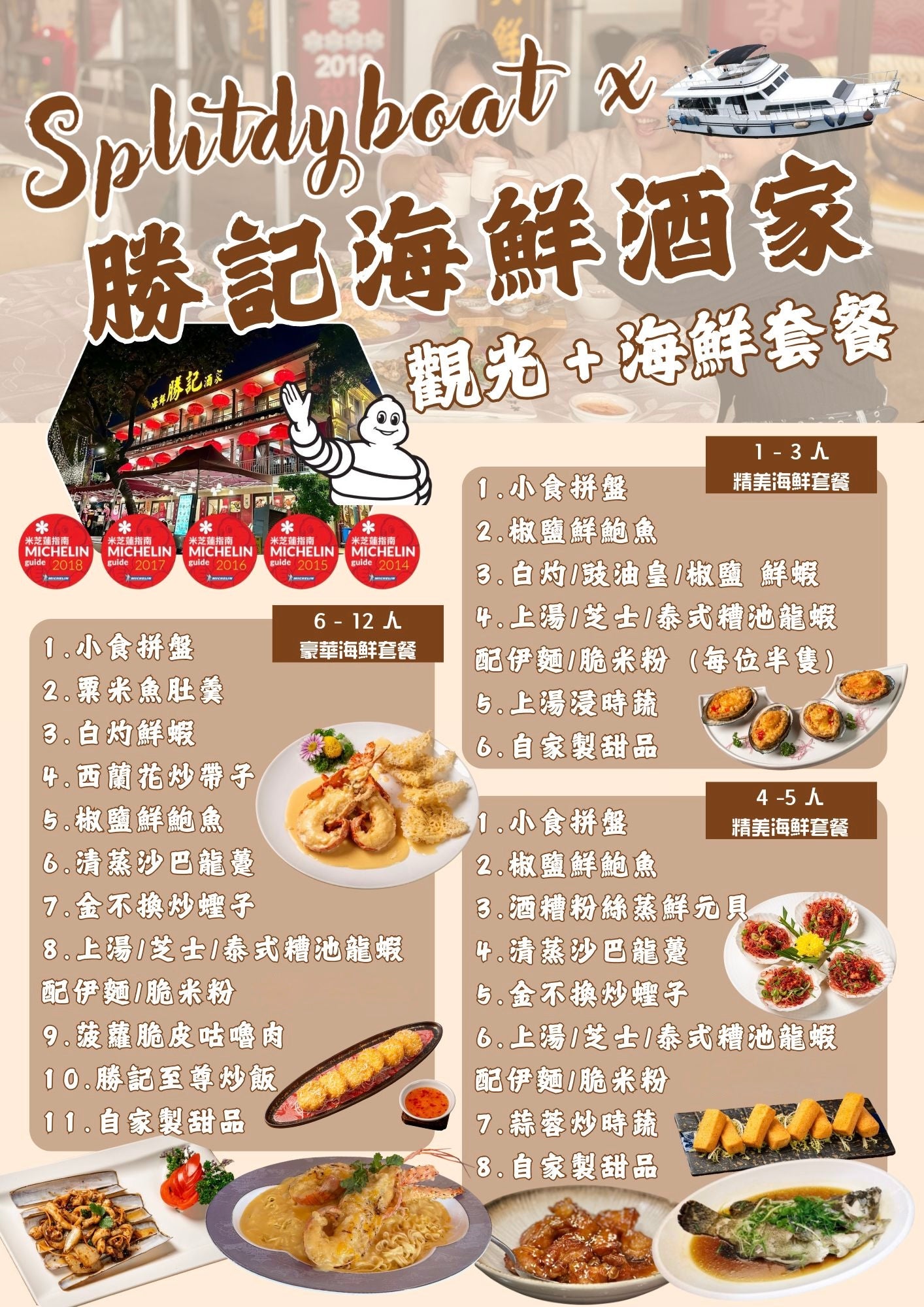 * 6-12人:享6-12人套餐11道菜+4小時遊艇團(每位999)