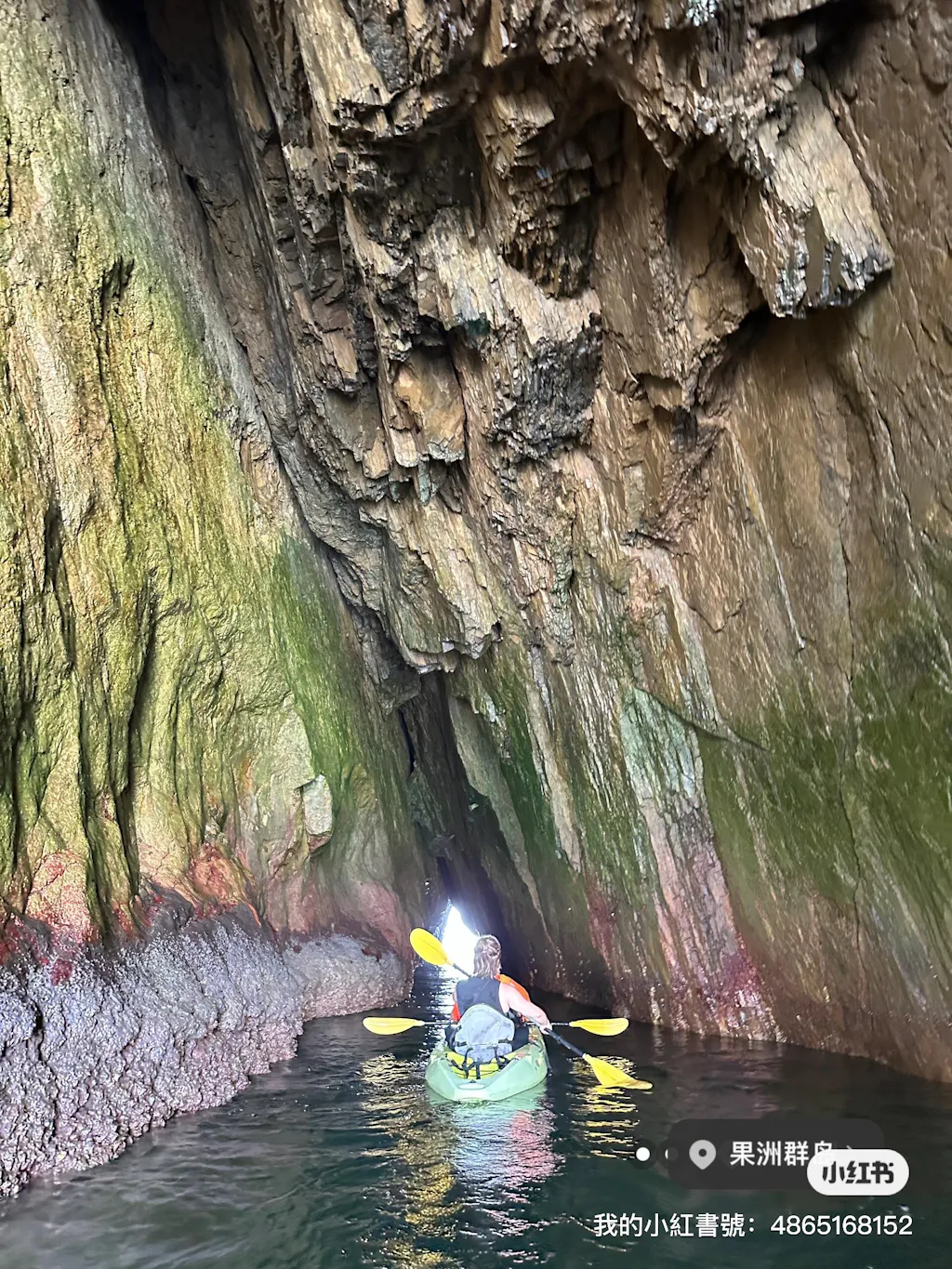 在南果洲的迴流洞東入口內,獨木舟(皮划艇)愛好者被一條如畫般且光線昏暗的海隧道包圍,隧道的岩石牆壁崎嶇不平,光影交錯創造出一種超凡脫俗的氛圍,隨著波浪在狹窄的通道中湧動,放大了海洋的原始力量。